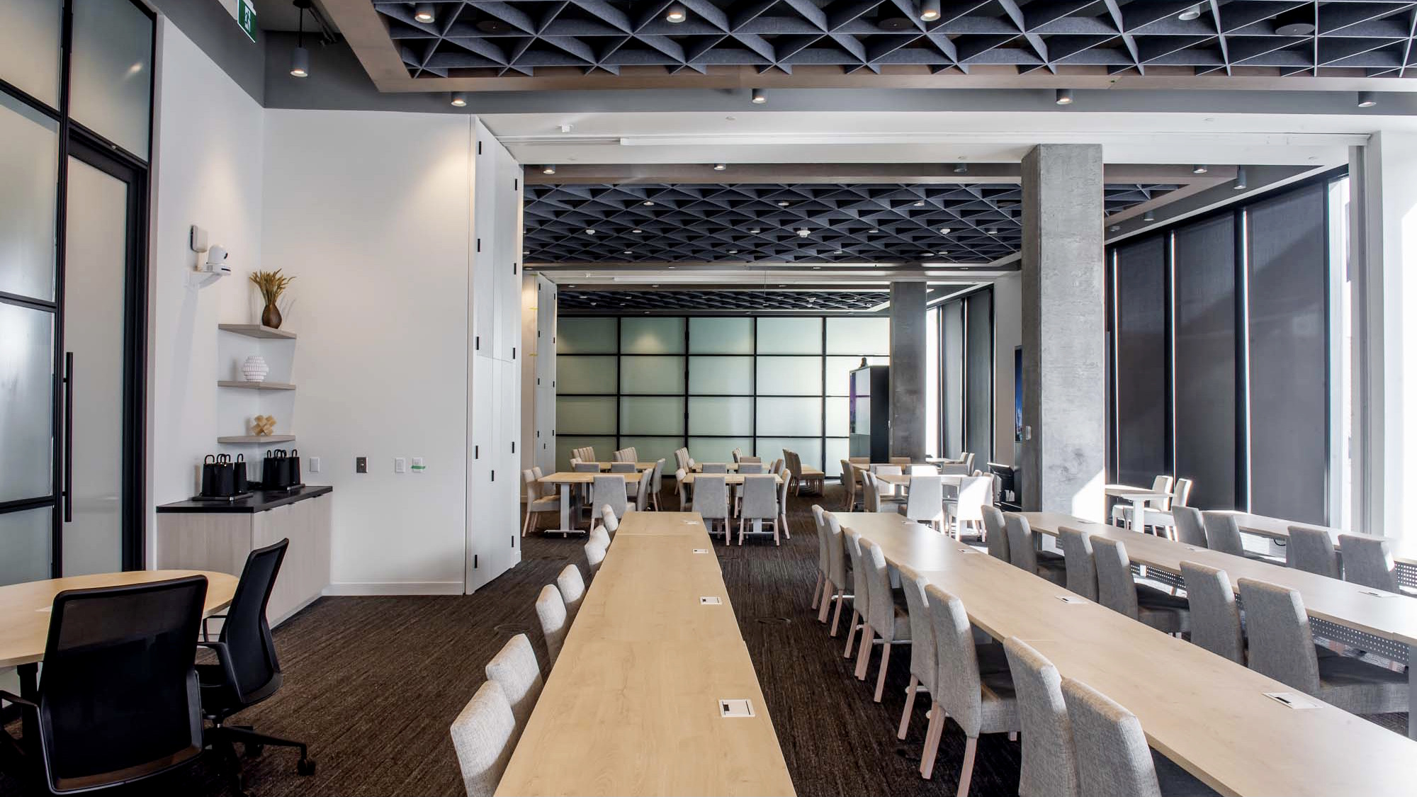 Large windows, high concrete ceilings and natural wood accents carry through to an inviting entryway and lounge, large gala space, multiple meeting rooms, innovative digital studio, and breakout spaces inclusive of a media zone and café. Outside, guests are transported to a lush third floor terrace offering impressive city views by day or night.